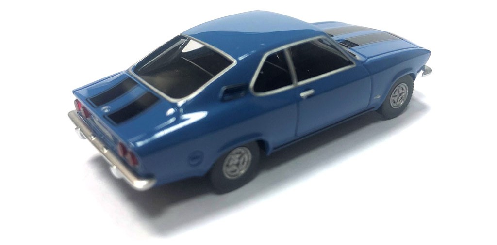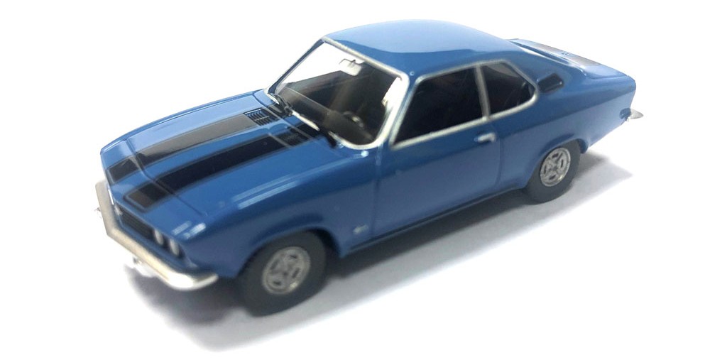 Blue body with black stripes , chrome bumpers and black interior |