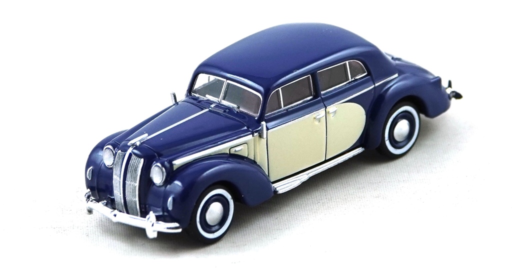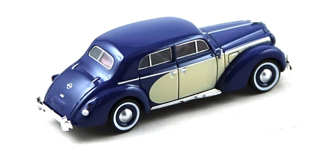 Dark blue body with light cream sides , lots of chrome , bumpers