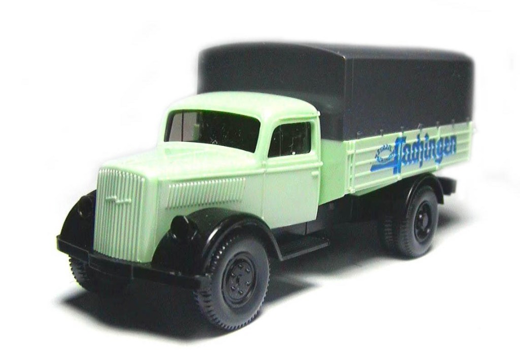 Light green cabin and cargo box , grey canvas , black chassis ,