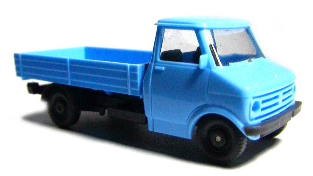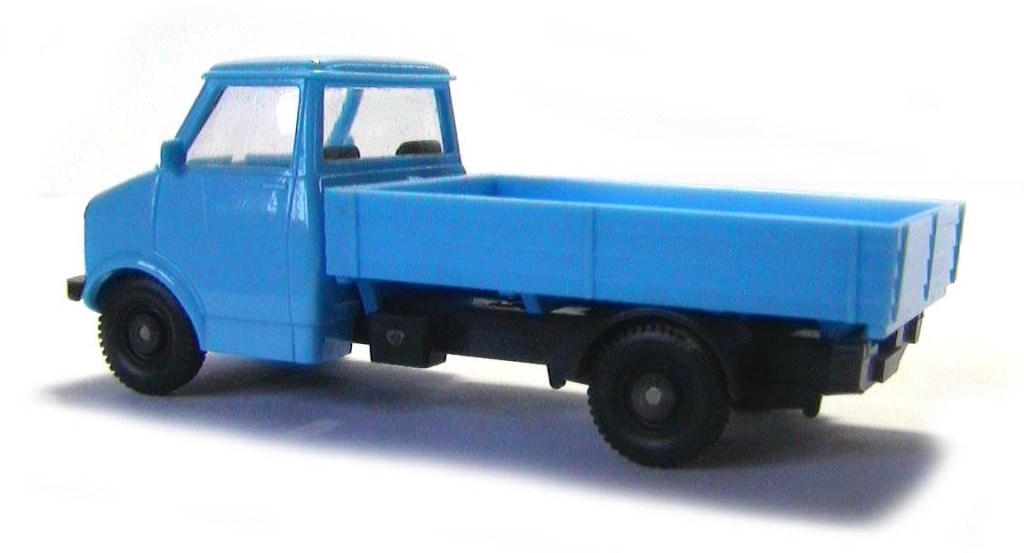 Blue cabin and open cargo box , black chassis bumpers and wheels |