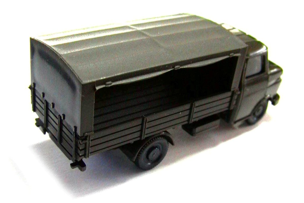 Dark green cabin , cargo box , canvas , chassis rear mud guards , bumpers