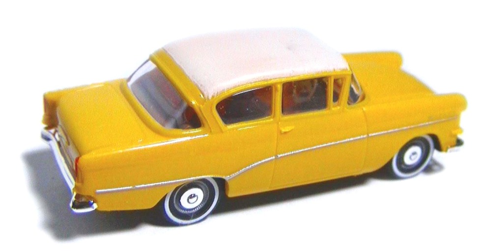 Bright yellow body , white roof , plastic headlights , chrome