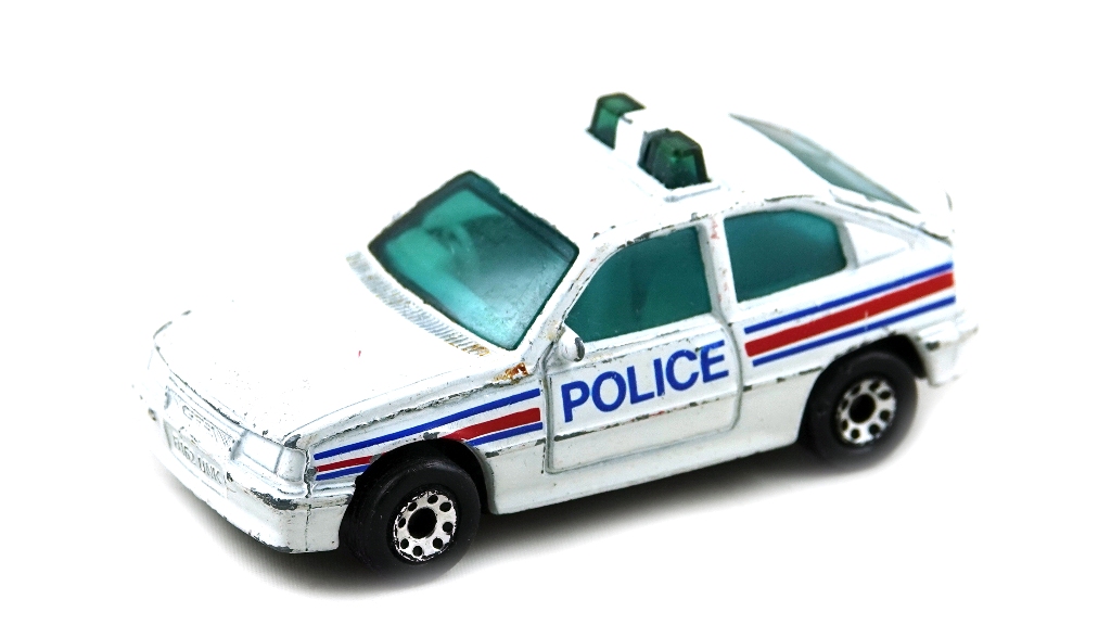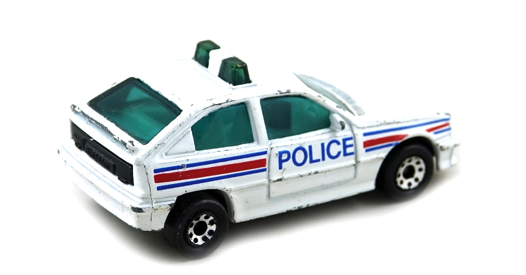 White body , blue and red side stripes , blue Police on