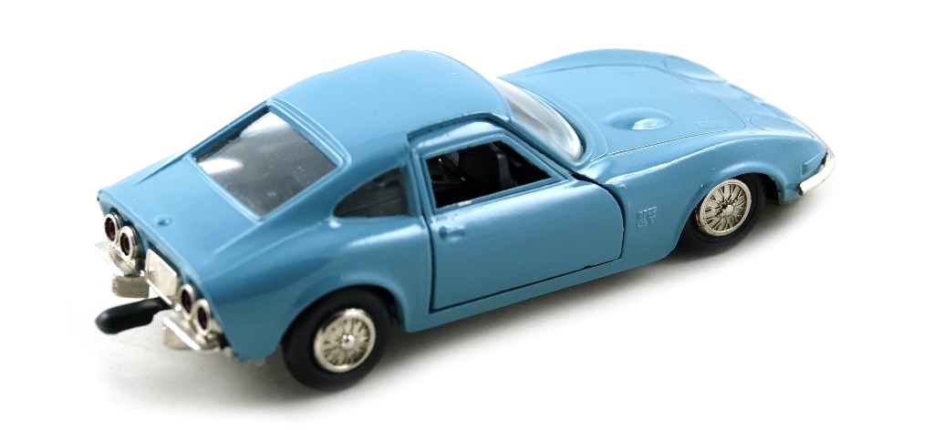 Light metallic blue body , black interior , chrome bumpers