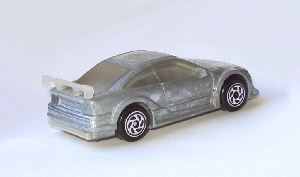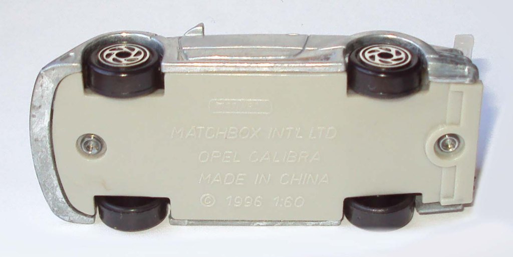 NÂș 568 of my 1/ 64 collection , is another prototype of the well known Matchbox DTM Calibra . The metal body is unpainted and some kind of translucent plastic for windows and rear spoiler . Wheels are plastic ww with chromed center patern , turbo type , and the base is reveted . Engraved on the white plastic base is the Matchbox badge , Matchbox Intl Ltd , Opel Calibra , Made in China and c 1996 1:60 . Car is similar to the finished item , only wheels are very different .