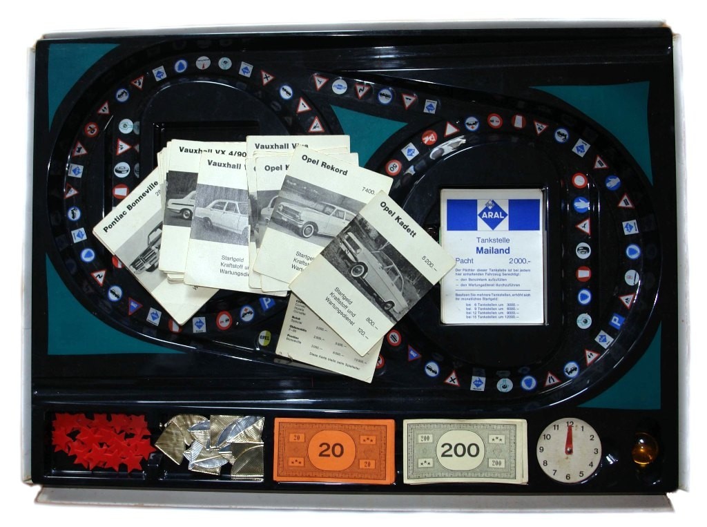 German game , maker I'm not sure but I think is Constri . Bought on Ebay , this game must be from the 60's , because cars on the cards are all from the 60's . It seems a Monopoly type game with money , order and prize cards . Instead of streets here we have cars , all GM models specialy Opel but also Vauxhall , Buick , Cadilac , Oldsmobile and Pontiac . I don't know if it was comossioned or not by GM as we find also another commercial brand Aral .