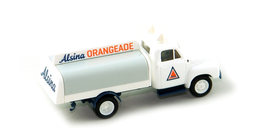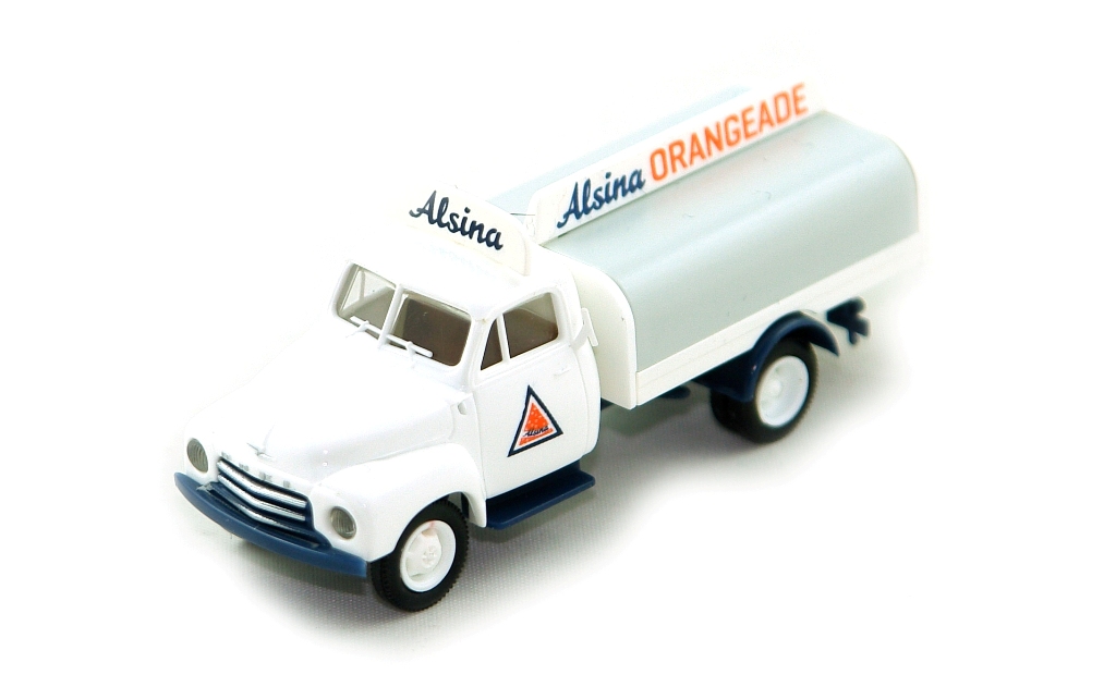 White cabin and cargo box , grey canvas , blue chassis , bumpers