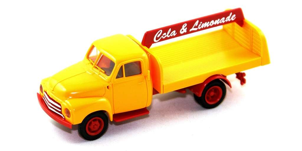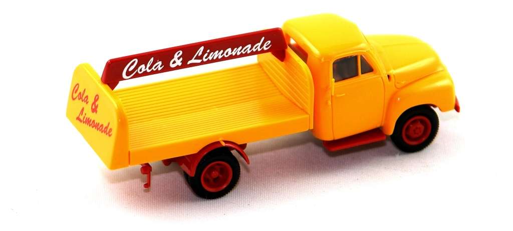 Yellow cabin and cargo box , red top , chassis , bumpers , rear