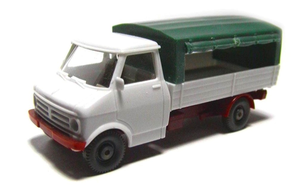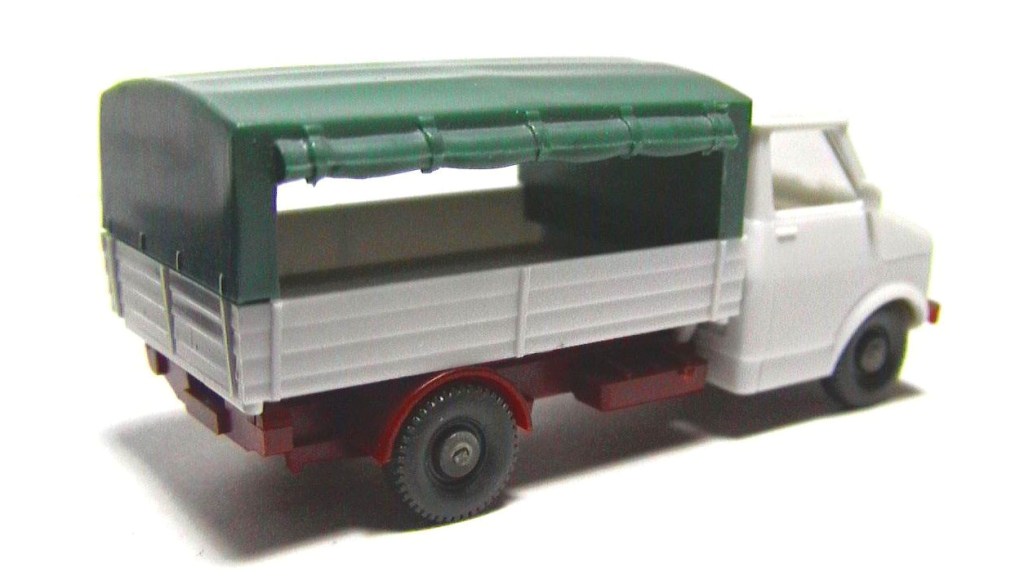 White cabin and cargo box , green canvas , red chassis and bumpers ,