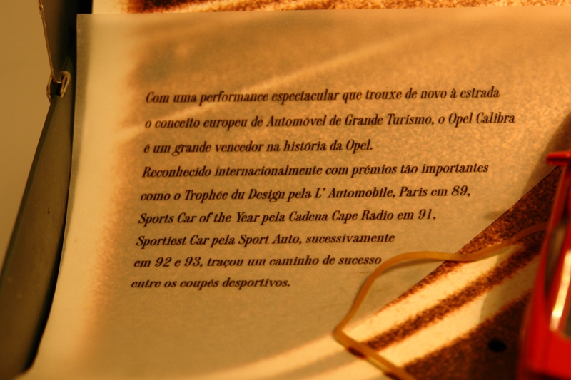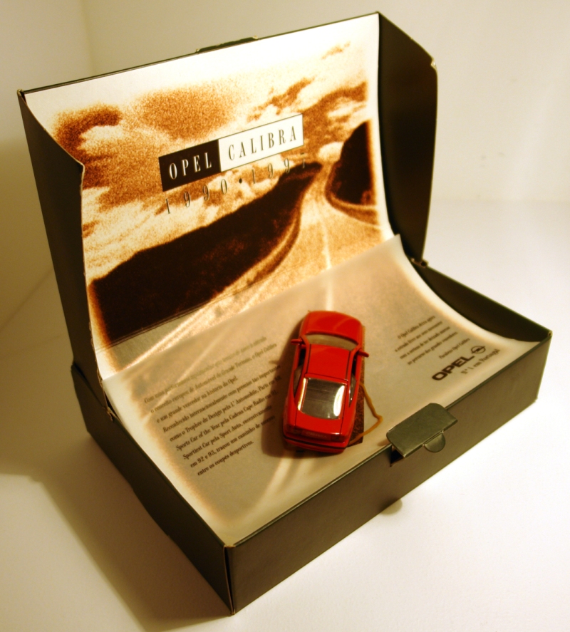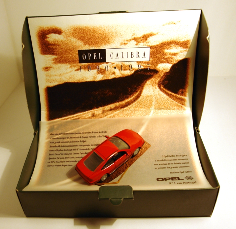 | The Calibra wasn't a big succes here in Portugal , because it was very expensive , price of cars here was based on the size of the motors . At the end of production Opel Portugal made an handfull comemorative boxes with a Schuco model . Mine is the second I have saw , the other is in the Aveiro Opel dealer and is almost mint . |